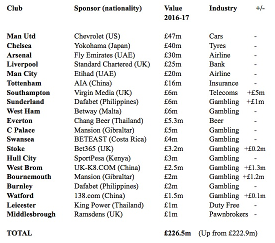 Nella stagione 2016-2017 la Premier League ha toccato la cifra record di 226,5 milioni di sterline per quanto riguarda gli accordi di sponsorizzazione di maglia dei club (stando ai dati forniti dal sito specializzato sportintelligence.com), ovvero poco più di 264 milioni di euro al cambio odierno. Nella scorsa stagione gli accordi furono di 222,9 milioni di sterline totali.