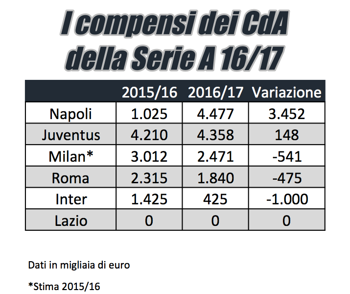 La società partenopa è quella che ha aumentato, tra le big, maggiormente i compensi ai propri amministratori, passando come detto da poco più di un milione nell’esercizio al 30 giugno 2016 ai 4,47 del 2016/17. Compensi stabili per la Juventus, mentre in calo per Milan, Roma e Inter, con i rossoneri che hanno avuto un calo dovuto principalmente al cambio di proprietà.