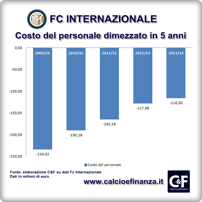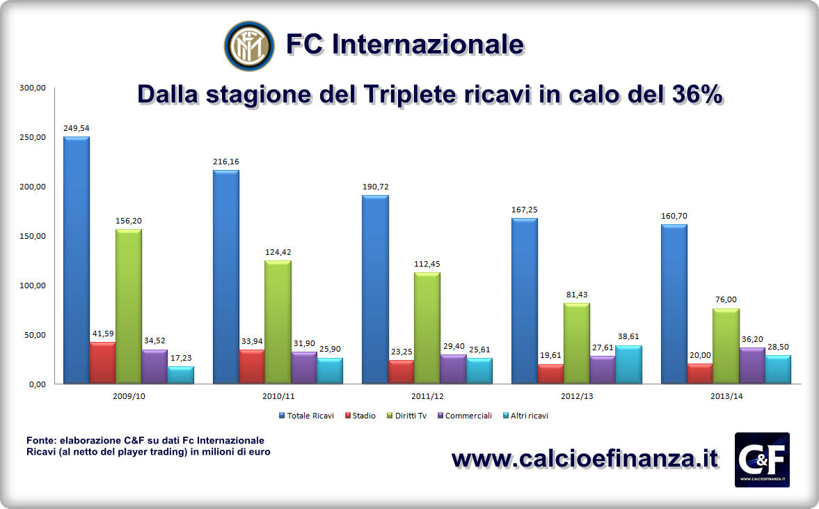 Nonostante lo sforzo fatto dalla dirigenza nerazzurra per contenere i costi operativi, scesi a 195 milioni dai 215 milioni dell’esercizio precedente, l’impatto della mancata partecipazione alle coppe europee nella stagione 2012/13 ha fatto scendere i ricavi caretteristici (dunque al netto della gestione del parco calciatori) al livello più basso delle ultime 5 stagioni (160,7 milioni dai 167,2 milioni dell’esercizio precedente), con una flessione del 35% rispetto alla stagione 2009/10, quello dello storico Triplete Coppa Italia, Campionato e Champions League.