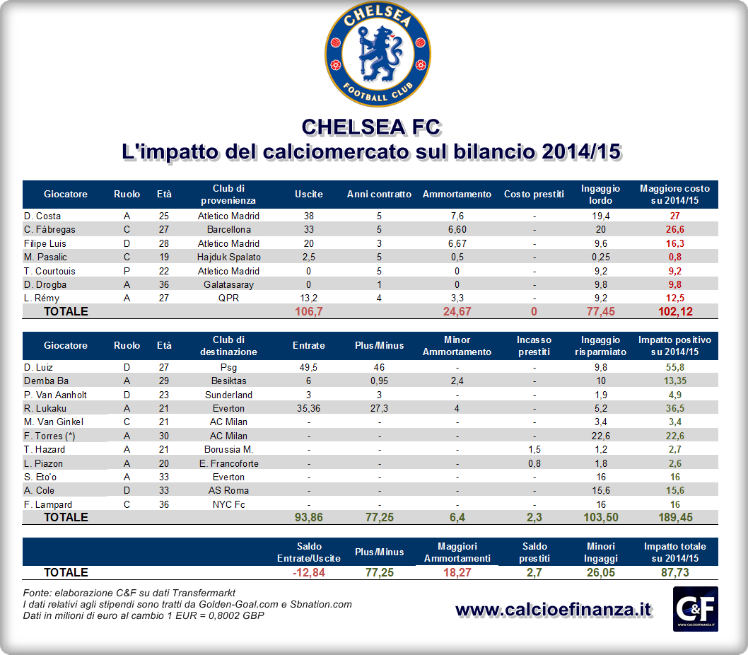 Nonostante gli stipendi dei nuovi acquisti Diego Costa, Fabrega, Filipe Luiz e Loic Remy (i dati sono stati acquisiti dai database di Golden-Goal.com e Sbnation.com) siano altrettanto consistenti, il saldo tra i costi legati ai nuovi ingaggi e quelli relativi ai giocatori ceduti è positivo per circa 26 milioni di euro.