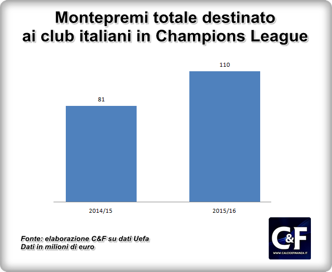 A questo si aggiungerebbero poi una quota fissa (circa 8,6 milioni) per la partecipazione alla fase a gironi e i premi legati alla performance (1 milione a vittoria, 0,5 milioni per il pareggio). Ovviamente se, come accaduto nella stagione 2014-2015, le squadre italiane in Champions fossero solo due, il market pool, reso ricco da Mediaset, verrebbe spartito solo tra questi due club. In tal caso la vittoria dello scudetto potrebbe valere addirittura 57,7 milioni.