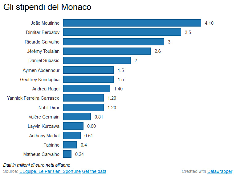 Non che i giocatori del Monaco guadagnino poco, anzi. Ma sono in pochi a toccare cifre da top player, al contrario degli juventini. Tra i giocatori di Jardim, il più pagato – secondo i giornali francesi – è Joao Moutinho, presentato lo stesso giorno di James Rodriguez nel 2013: il portoghese prende 4,1 milioni di euro netti a stagione, grazie ad un contratto firmato quando la società seguiva altre politiche sugli ingaggi. Nella Juve, più di lui guadagnano Tevez e Pogba, mentre Buffon e Vidal lo eguagliano.