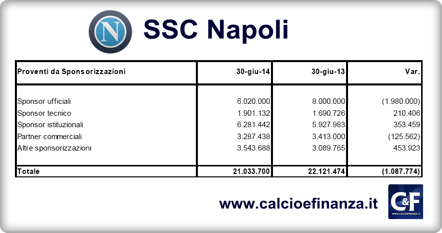 Nella stagione 2013/2014, l’ultima per la quale è già stato pubblicato il bilancio di esercizio, il Napoli ha incassato dalle sponsorizzazioni una cifra di 21,03 milioni, in leggera flessione rispetto ai 22,12 milioni del 2012/2013. Nel dettaglio il contributo degli sponsor ufficiali, tra cui Acqua Lete, al conto economico del club è stato di circa 6 milioni nell’esercizio 2013/2014 contro gli 8 milioni dell’esercizio precedente.