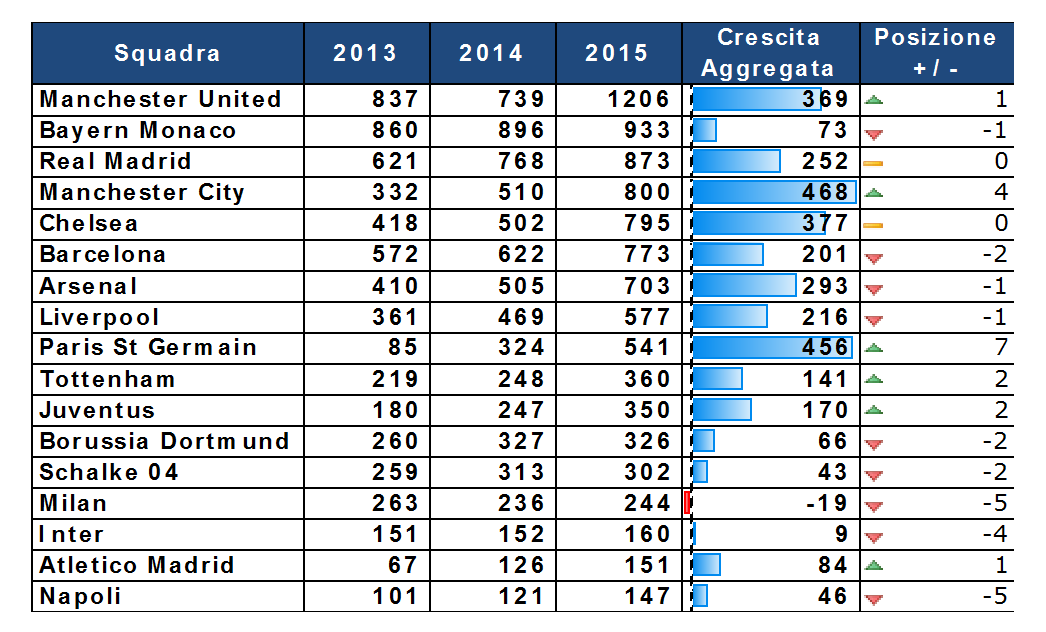 Le squadre sono state considerate ed ordinate secondo il loro brand value, mentre nella colonna crescita aggregata vediamo di quanto è cresciuto negli ultimi tre anni ciascun brand in funzione dei risultati sportivo/commerciali. L’ultima colonna indica invece un guadagno/perdita di posizione nella classifica.