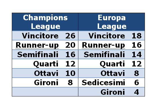Nell’analisi abbiamo preso come riferimento i punteggi per i vari piazzamenti nelle competizioni Uefa attribuiti dall’Eca (l’associazione che riunisce i club europei) e dalla società di consulenza Pricewaterhouse Coopers (PWC) in un recente studio sul sistema dei trasferimenti a livello europeo.