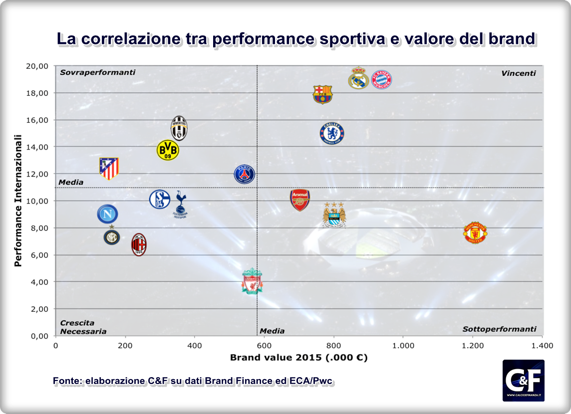 Esiste qualche tipo di relazione tra la prestazione sportiva di una squadra di calcio, misurata su un orizzonte temporale pluriennale, e il valore del brand del club? Per rispondere a questa domanda C&F ha provato a costruire di una matrice che incrociasse tra loro i dati riguardanti le prestazioni sportive dell’ultimo triennio dei principali club Europei con il valore dato a ciascuna società dalla società Brand Finance. Ecco i risultati.