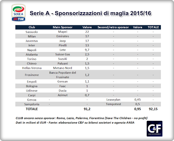 Se da sola la Chevrolet versa 60 milioni all’anno a una sola squadra inglese, in Italia il valore totale delle sponsorizzazioni arriva a 92 milioni. Come analizzato da Calcio&Finanza, a comandare la classifica non c’è nessuna big del campionato, ma il Sassuolo. La squadra di proprietà di Giorgio Squinzi, numero uno di Mapei, si garantisce 22 milioni di euro all’anno dall’azienda leader nel settore chimico. Di fatto, si tratta di una sponsorizzazione legata alla proprietà, che non avrebbe avuto lo stesso valore se si fosse trattato di un altro sponsor non legato all’azienda.