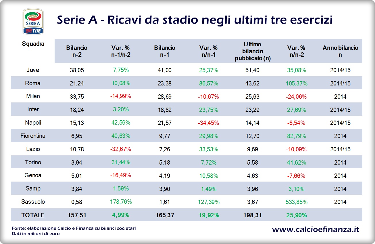 Fiorentina e Lazio, seppur con valori differenti in assoluto, hanno saputo capitalizzare le partecipazioni alle Coppe, aumentando i ricavi da stadio di un terzo sul bilancio precedente, fermandosi rispettivamente a 12,70 e 9,69 mln di euro: da segnalare che due bilanci fa la Lazio faceva registrare un valore superiore alla Viola di più del 45%.