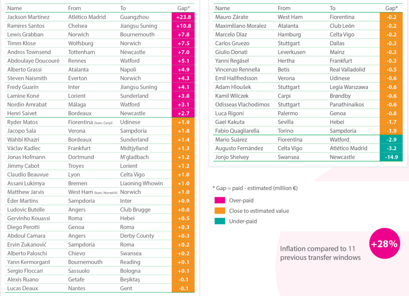 Il giocatore più strapagato della sessione di mercato di gennaio è stato Jackson Martínez: 42 milioni di euro anzichè 18,2 (+23,8 milioni di €). Tra i cinque giocatori che sono stati pagati più del loro valore reale si trovano poi Ramires (+10,8 milioni di €) anche lui andato a giocare in Cina, e tre calciatori che si sono trasferiti nella Premier League inglese: Lewis Grabban (+7,8 milioni di €), Timm Klose (+7,5) e Andros Townsend (+7,0).