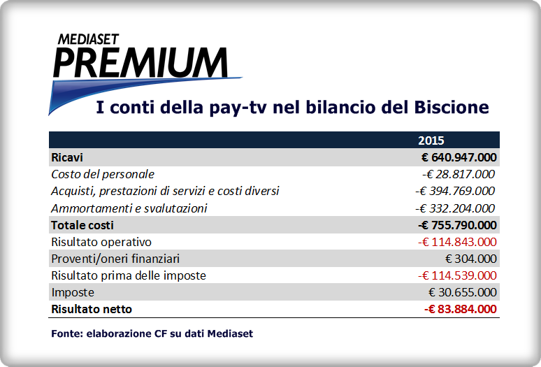 Un risultato negativo nel primo anno d’esercizio era stato messo in preventivo da Cologno Monzese che, al momento del lancio della nuova Premium, aveva stimato il raggiungimento del break even a partire dal secondo semestre 2016.