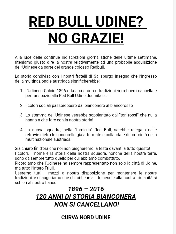 «Voci sempre più insistenti oggi dicono che la Red Bull ha già effettuato un’offerta per acquistare l’Udinese: la nostra risposta, visti i precedenti a Lipsia e soprattutto a Salisburgo, non può essere che una: NO RED BULL! – si legge sul profilo Facebook Ultras 1995 -. Cominciamo tutti quanti a condividere il più possibile il dissenso e a boicottare l’azienda austriaca! Probabilmente è giunto il momento di lottare per salvaguardare la nostra storia e i nostri colori: NO RED BULL!». Parole a cui è seguito anche un comunicato, pubblicato sul social network negli ultimi giorni.