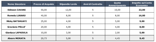 Discorso simile per Lukaku, dove il costo sarebbe di 16 milioni di Euro all’anno (6 in meno di Cavani) e dove il “tesoretto plusvalenza Morata” sarebbe utilizzato per un valore pari a 7 milioni di Euro.