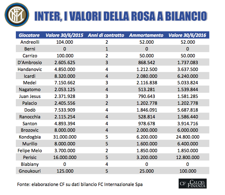 Motivo per cui noi di CF – Calcioefinanza.it abbiamo analizzato i dati del bilancio nerazzurro, arrivando ad una simulazione di quelli che dovrebbero essere i valori dei giocatori in rosa nel bilancio al 30/6/2016. Valore da cui si partirà per calcolare le eventuali plusvalenze in caso di cessione.