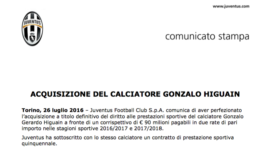 La Juventus, dunque, ha fatto valere la clausola risolutoria, versando nelle casse del Napoli di Aurelio De Laurentiis i 90 milioni previsti dal contratto, rendendo così Higuain libero di trasferirsi in bianconero (sarebbero stati 94,7 in caso fosse stato il calciatore a pagare la clausola per liberarsi).