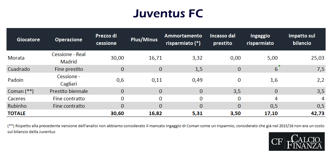È dunque evidente che per non appesantire in modo importante il prossimi bilancio la Juventus dovrà procedere a qualche cessione in modo da compensare i costi legati al mercato in entrata con plusvalenze e risparmi di costi (minori ammortamenti e minori ingaggi).