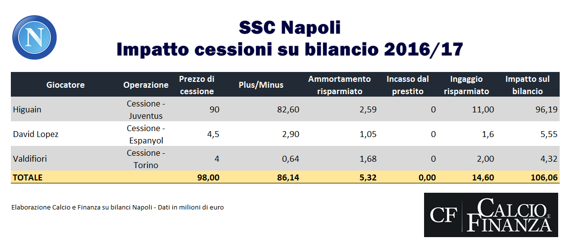 Insieme all’argentino, le altre cessioni rilevanti del Napoli sono quelle di David Lopez e Valdifiori: entrambe le partenze hanno ritoccato il totale delle plusvalenze (2,92 e 0,64) che sale a 86,14 milioni di euro; ma i due mancati ingaggi alleggeriranno nel complesso i conti per altri 3,6 milioni di euro.