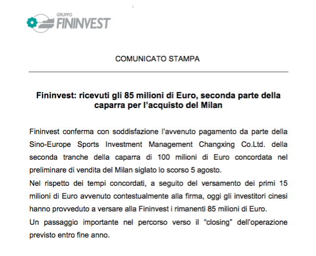 “Fininvest – si legge nella nota ufficiale dell’azienda di Silvio Berlusconi – conferma con soddisfazione l’avvenuto pagamento da parte della Sino-Europe Sports Investment Management Changxing Co.Ltd. della seconda tranche della caparra di 100 milioni di Euro concordata nel preliminare di vendita del Milan siglato lo scorso 5 agosto.