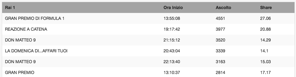 Il Gran Premio di Formula 1 di Singapore è stato l’evento televisivo più seguito della domenica, con 4 milioni e 551 mila spettatori, con uno share del 27,07%. Lo comunica la Rai in una nota dedicata ai risultati registrati ieri, 18 settembre, dalla tv di Stato. “Su Rai1 alle 14.00 – scrive viale Mazzini – il Gran Premio di F1 di Singapore ha ottenuto 4 milioni 551 mila spettatori e uno share del 27,07; su Rai2 grande ascolto per La domenica sportiva che è stato il programma più visto in seconda serata con 1 milione 605 mila spettatori e uno share dell’11,59. Molto bene alle 15.40, sempre su Rai2, Quelli che il calcio con 1 milione 85 mila spettatori e uno share del 7,53”.