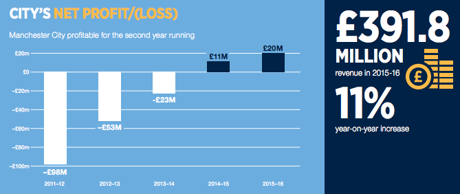Secondo il presidente del club Khaldoon Al Mubarak, con i risultati raccolti nella stagione 2015-2016 “il Manchester City ha ormai raggiunto un livello di maturità sportiva e commerciale che permette il reciproco sostentamento“. Per Al Mubarak, del resto, era “questo il percorso per il successo che avevamo in mente dal 2008”, sottolinea. “Il City – aggiunge – chiude la stagione 15-16 con un profitto di 20.5 milioni di sterline, aumentando le proprie revenue per l’ottavo anno consecutivo e continuando a operare con zero debito finanziario“, spiega Al Mubarak.
