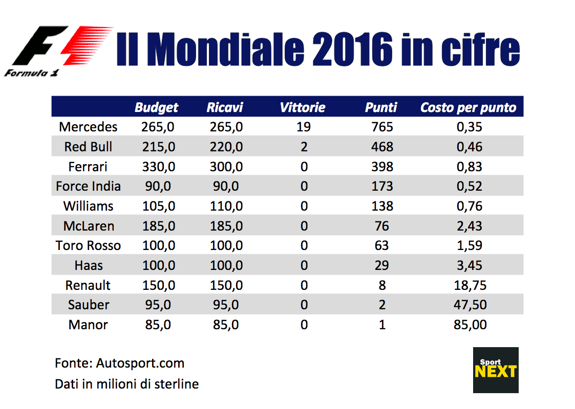 Ad analizzare budget e ricavi è stata la rivista specializzata Autosport, che ha pubblicato il riassunto della stagione che ha visto la Mercedes conquistare il successo in 19 delle 21 gare in programma. Eppure non è la scuderia di Brackley non è quella che spende di più.