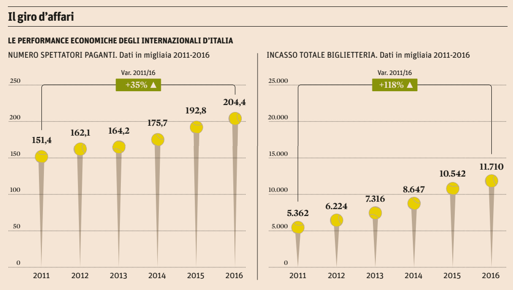I dati riportati recentemente da Il Sole 24 Ore evidenziano come gli Internazionali d’Italia, organizzati in joint-venture da Fit e Coni Servizi Spa con il supporto di Bnl Gruppo Bnp Paribas (title sponsor per l’undicesima volta consecutiva) sia una manifestazione in salute che continua ad alzare l’asticella della performance.