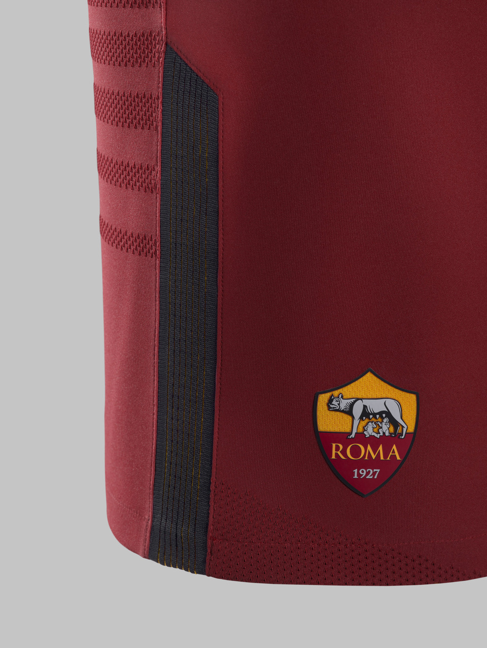 Il pantaloncino è rosso con una banda nera su entrambi i lati. Lo stemma della Roma sulla destra, lo swoosh in giallo sulla sinistra. La divisa è completata da calze nere dotate della tecnologia Nike Grip, con la scritta “Roma” in rosso sulla parte frontale, sul retro strisce orizzontali gialle.