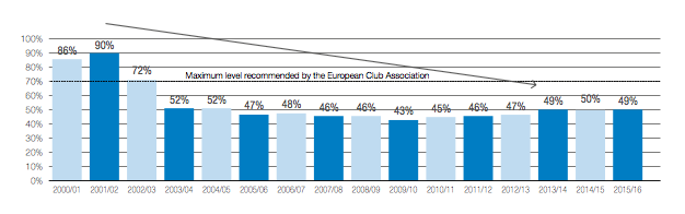 Non a caso la voce stipendi è sì la più alta, ma con una bassa incidenza sul fatturato: nel 2015/16 il costo del personale è stato pari al 49,5% del fatturato, in calo rispetto al 50,1% del 2014/15, decisamente ben lontano dal 70% identificato dalla European Club Association identifica come livello massimo.