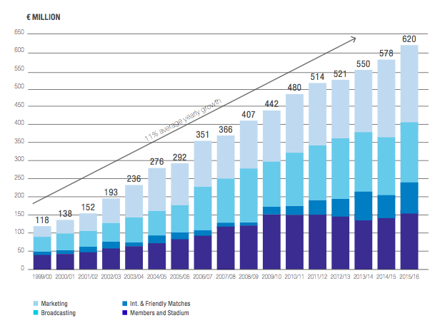 Negli ultimi cinque anni il fatturato (al netto dei ricavi legati alla gestione del parco calciatori) del Real Madrid è sempre stato in costante crescita: i blancos, infatti, sono passati da contabilizzare 513,9 milioni nel 2011/12 a 620,1 milioni di Euro nella stagione 2015/16 (ultimi dati disponibili).