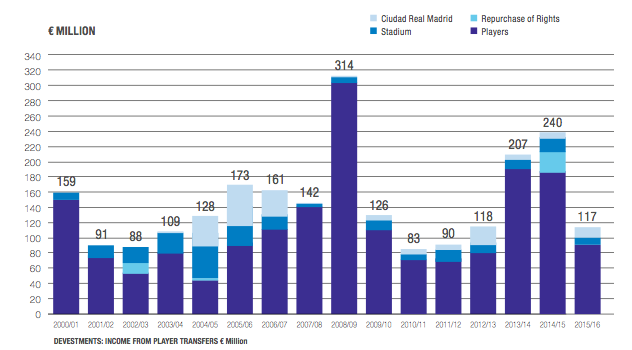 Nei 16 anni che vanno dal 2000/01 al 2015/16, inoltre, la società ha investito 241 milioni di euro nello stadio, tra modernizzazione delle strutture, miglioramento della fruibilità per gli spettatori, servizi multimediali e aree commerciali. Senza dimenticare i 197 milioni di euro per per la costruzione della “Ciudad Real Madrid”, il più grande centro sportivo al mondo per una squadra di calcio (120 ettari, 10 volte più grande del precedente centro sportivo dei blancos).