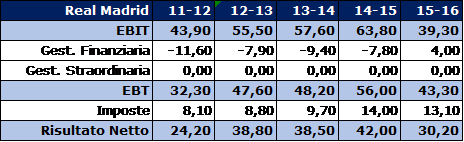 Il Real Madrid è passato 150,5 milioni di EBITDA ai 162,9 milioni dello scorso anno e dai 43,9 milioni del 2011/2012 ai 39,3 di EBIT dell’esercizio conclusosi il 30 giugno 2016. Ragionando in termini percentuali sul fatturato lordo, i blancos, nello scorso esercizio, hanno presentato un EBITDA del 26,2% e un EBIT del 6,3%. In relazione alla mole di fatturato prodotta, il Real Madrid “soffre” meno l’input “ammortamenti”, che pur essendo alti possono essere assorbiti facilmente dalla struttura dei conti dei blancos.