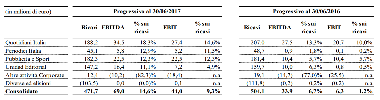 L’Ebitda dell’area Quotidiani Italia si è attestato al 30 giugno 2017 a 34,5 milioni, in crescita di 7 milioni rispetto ai 27,5 milioni del primo semestre 2016.
