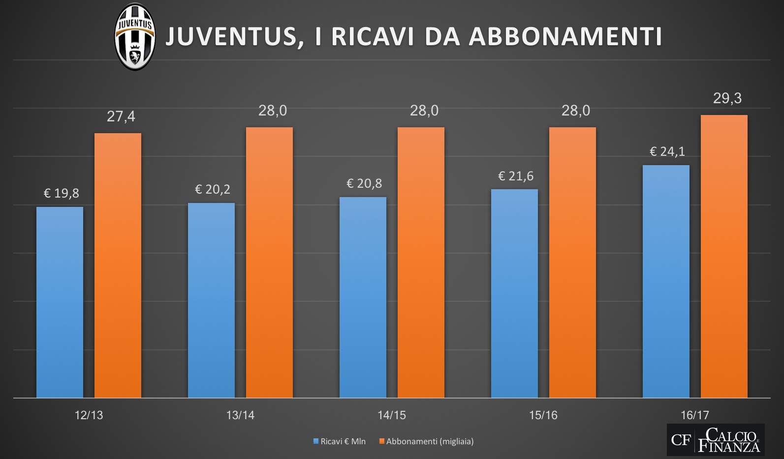 Dal 2011/12 al 2015/16 (i dati del 2016/17, che dovrebbero salire visto il maggior numero di gare in Champions League) non saranno disponibili prima dell’autunno), infatti, la Juventus ha avuto ricavi da stadio per complessivi 207 milioni, con una media di 41 milioni annui. Circa 15 in media l’anno in più di quanto incassato dal Milan, 19 in più dell’Inter e più del doppio rispetto al Napoli. Un dominio, agevolato anche dall’aumento dei ricavi da abbonamenti (spinto a sua volta dall’aumento dei prezzi dei tagliandi stagionali).