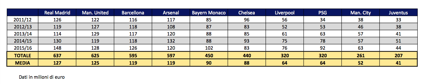 La Juventus ha infatti ricavi da stadio pari a circa 1/3 di quelli di Real Madrid, Manchester United, Barcellona e Arsenal, che incassano tra i 127 e i 119 milioni di euro. Una distanza più che doppia separa i bianconeri da Bayern Monaco e Chelsea, con Liverpool e PSG lontani poco più di 20 milioni. A portata di “aggancio”, invece, il Manchester City, che nel 2015/16 (ultimi dati disponibili) ha infatti avuto ricavi da stadio maggiori per “soli” 11 milioni rispetto al club guidato da Andrea Agnelli.