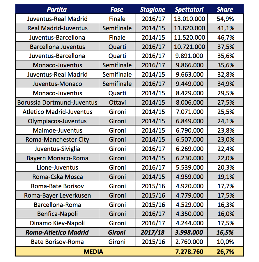 La gara tra Roma e Atletico Madrid è inoltre la quarta peggiore in termini di share: oltre a Bate-Roma, peggiori risultati sono stati ottenuti da Barcellona-Roma (fase a gironi della Champions 2015/16, 16,3%) e Benfica-Napoli (fase a gironi della Champions 2015/16, 16,0%).