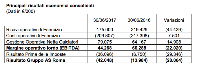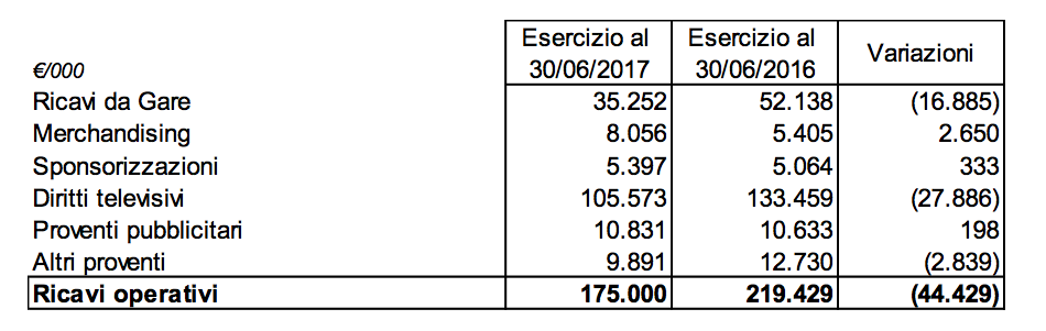«I ricavi complessivi consolidati conseguiti nell’esercizio, tenendo conto anche dei proventi generati dalla gestione calciatori, sono pari a 278,4 milioni di euro (311,1 milioni di euro, al 30 giugno 2016). In particolare, includono plusvalenze conseguite nell’ambito dei contratti di cessione di diritti pluriennali (calciatori) per 95,2 milioni di euro (77,5 milioni di euro, al 30 giugno 2016), altri proventi generati dalla gestione calciatori per 8,2 milioni di euro (14,2 milioni di euro, al 30 giugno 2016), e ricavi operativi per 175 milioni di euro (219,4 milioni di euro al 30 giugno 2016), di cui 32,2 milioni di euro derivanti dalla partecipazione alle competizioni internazionali (81 milioni di euro, al 30 giugno 2016)».