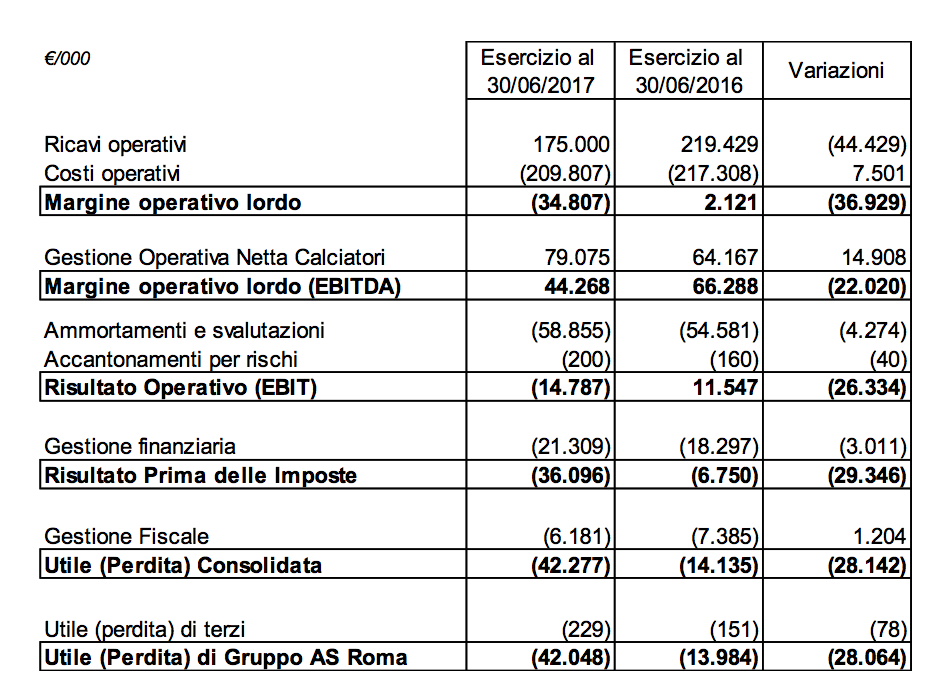 Il Consiglio di Amministrazione di A.S. Roma, riunitosi ieri, ha approvato il Progetto di bilancio d’esercizio ed il bilancio consolidato relativi all’esercizio chiuso al 30 giugno 2017. Un esercizio che, come noto, si è chiuso con una perdita netta a livello consolidato di 42,6 milioni di euro, in aumento rispetto al rosso di 14 milioni registrato nel bilancio chiuso al 30 giugno 2016.