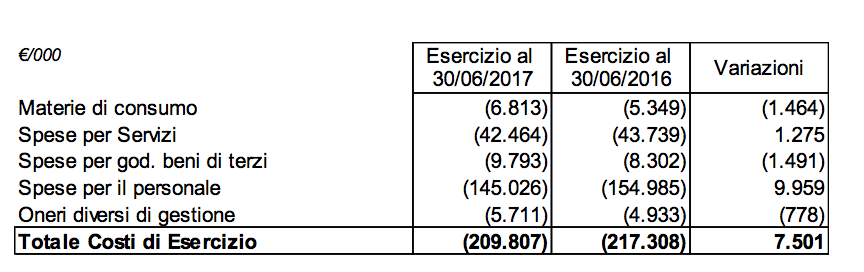 «I costi operativi consolidati al 30 giugno 2017 sono pari a 209,8 milioni di euro (217,3 milioni di euro, al 30 giugno 2016), con un miglioramento di 7,5 milioni di euro dovuto principalmente alla riduzione del costo del personale tesserato».