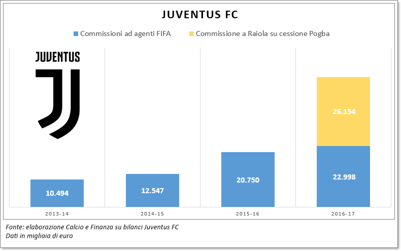 Secondo i dati riportati nel bilancio al 30 giugno 2017 della società bianconera, nella scorsa stagione le commissioni riconosciute ad agenti FIFA dal club presieduto da Andrea Agnelli e guidato dall’amministratore delegato Beppe Marotta nell’ambito delle operazioni di calciomercato in entrata e in uscita e a fronte di rinnovo contrattuali sono state pari a 49,15 milioni di euro, in forte crescita rispetto ai 20,75 milioni della stagione 2015-2016 e ai 12,54 milioni del 2014-2015.