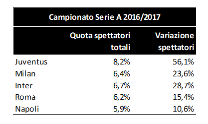 Quanto illustrato in merito agli spettatori da stadio viene confermato dai dati relativi agli ascolti televisivi. In particolare (nostre elaborazioni su dati fonte www.legaseriea.it), considerando il campionato di Serie A 2016/2017, emerge che la Juventus ha raccolto 75,7 milioni di spettatori TV (si considerano sia le partite casalinghe sia quelle in trasferta), dato di gran lunga superiore a quello di ciascun’altra big (il Milan, secondo, ne concentra 55,2 milioni).