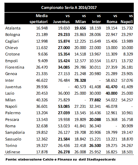 - i dati degli spettatori medi stagionali e con ciascuna big delle partite casalinghe di ogni squadra del campionato di Serie A del 2016/2017 (in grassetto è evidenziata la partita casalinga che ha registrato il massimo stagionale);