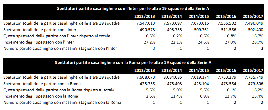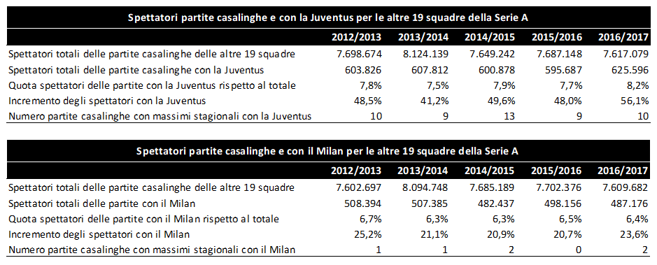 Se si considera che, generalmente, il prezzo medio dei biglietti delle partite contro la Juventus è sensibilmente superiore a quello medio stagionale (con punte anche del 40-50%), si può concludere che per ciascuna squadra di Serie A i ricavi delle partite con la Juve sono significativamente superiori a quelli registrati con ciascuna delle altre squadre, beneficiando pertanto di un positivo effetto volume (maggior numero di spettatori) e di un positivo effetto prezzo.