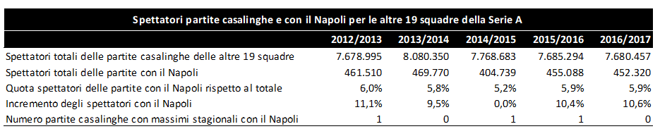 Estendendo l’analisi all’ultimo quinquennio, le conclusioni su indicate per la stagione 2016/2017, per quanto attiene al peso della Juventus per le altre squadre di Serie A, sono confermate e addirittura rafforzate per ciascun anno (il valore indicato alla voce “incremento degli spettatori” esprime la media semplice dell’incremento degli spettatori con ogni big rispetto alla media stagionale registrata da ogni squadra):