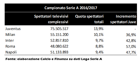 Considerando la quota degli spettatori di ogni squadra sul totale della Serie A, la Juventus ne assorbe il 14% circa, quota di ben 4 punti percentuali superiore a quella del Milan.