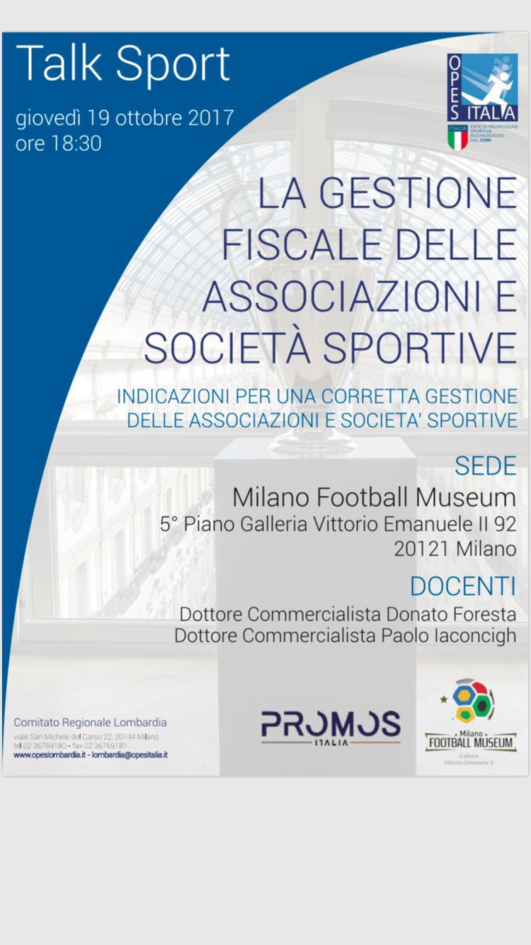 Si è tenuto nella giornata di ieri al Milano Football Museum, il “Talk Sport Fiscale” organizzato da OPES Lombardia, in collaborazione con lo Studio Commercialista Foresta e con Promos ssd.