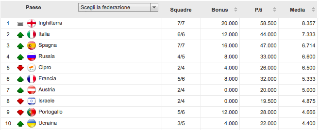 Considerando la classifica complessiva, l’Italia rimane terza a breve distanza dall’Inghilterra (-1,642 punti) ma sempre più lontana da Germania (+1,251, era a -2,654 ad inizio stagione) e Francia (+16,001, era a +14,001 ad inizio stagione).
