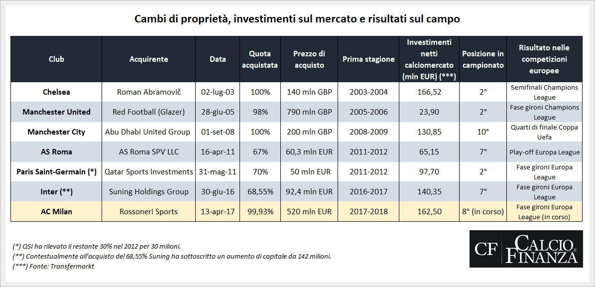 Eppure, solo in poche occasioni, i club che sono stati oggetto di un cambio di proprietà tra una stagione e l’altra sono riusciti ad ottenere, anche a fronte di ingenti investimenti sul mercato, importanti risultati sul campo.