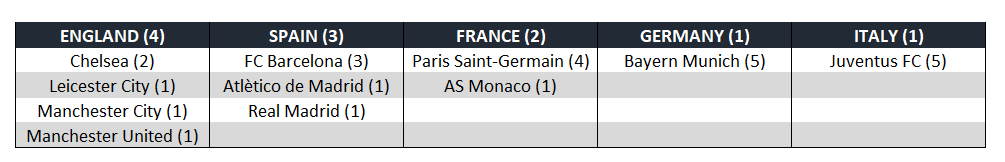 Segue l’Inghilterra, con quattro club (gli stessi che hanno trionfato nelle ultime cinque stagioni), mentre Spagna, Germania e Italia si fermano a tre.