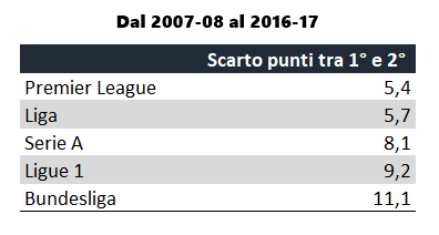 In Serie A il distacco medio tra la prima della classe (la Juventus campione nei cinque anni considerati) e il club classificatosi al secondo posto (tre volte la Roma e due volte il Napoli) è stato di 11,2 punti. Distacco sceso a 4 punti, quelli di differenza tra bianconeri e giallorossi, nella stagione 2016-2017.