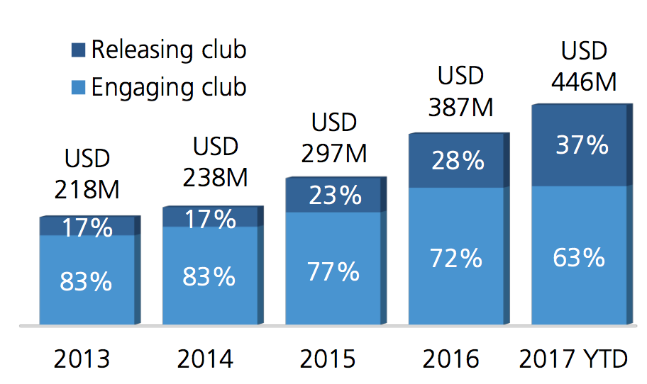 Con l’aumento delle operazioni con intermediari, si è impennato anche il costo degli stessi. La spesa per le commissioni è infatti cresciuta in modo significativo negli ultimi anni e ha raggiunto un nuovo massimo. Nel 2017 i club acquirenti pagato 281 milioni di dollari in commissioni agli intermediari, mentre 165 milioni di dollari per gli intermediari per le cessioni, per un totale di 446 milioni di dollari, cioè il 15,2% in più rispetto allo scorso anno (+104,6% rispetto ai 2013 milioni di dollari del 2013).