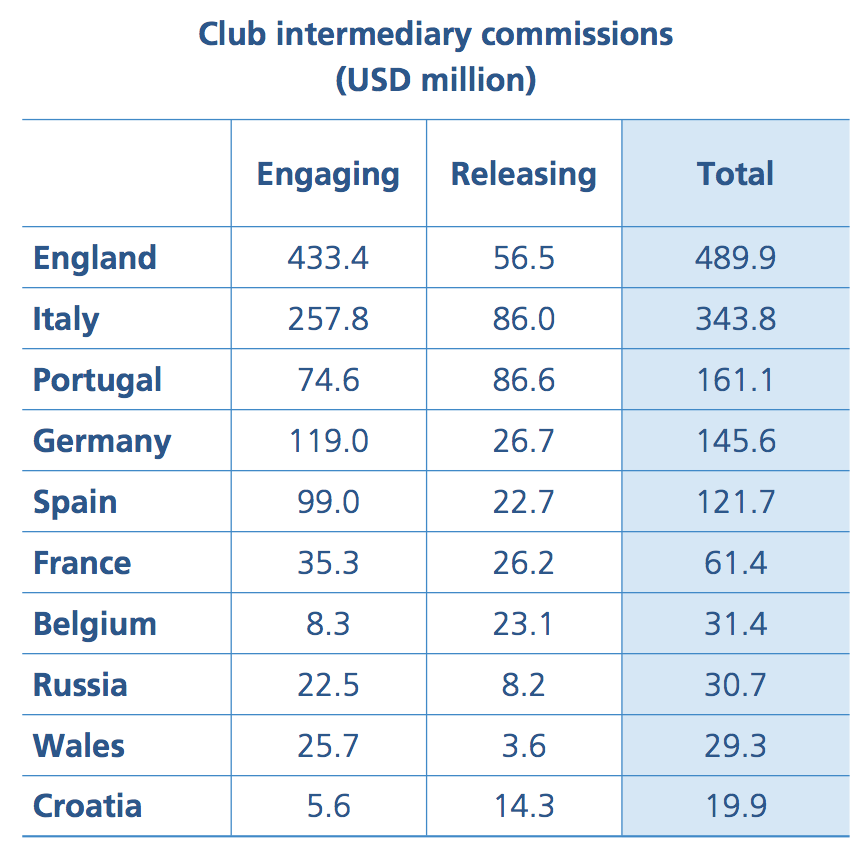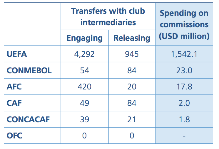 Dal 2013 la spesa complessiva per le commissioni è stata di 1,59 miliardi di dollari, di cui il 97,2% da club UEFA, che hanno speso in totale 1,54 miliardi di dollari, mentre il resto del mondo solo 45 milioni di dollari. Non a caso, i primi 10 paesi in termini di spesa per le commissioni di intermediazione sono tutte nazioni affiliate all’UEFA.